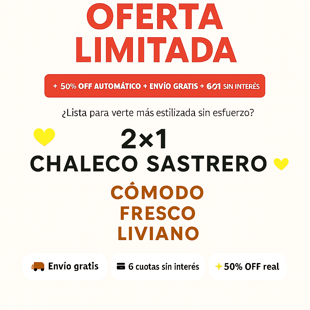 El chaleco sastrero es la prenda más buscada de la temporada ✨. Llévalo sobre una camisa, con un top o solo —siempre queda bien. Elegante, fresco y con ese toque moderno que eleva cualquier look. Aprovechá la promo 2x1 y llevate dos por el precio de uno 💫.
